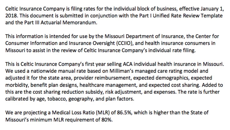 Normally I'd be pretty irritated by this, but to be honest, given what an utter mess the 2018 individual market landscape is shaping up to be, I can kind of understand this; the situation is even more fluid/confusing than ever, so I guess they figured there wasn't much point in posting the rate requests earlier than necessary if they're likely to change a dozen times before being locked in anyway. In any event, today the Missouri insurance department finally posted MO's requested rate changes for next year. This is kind of a big deal for the Show Me state, because until now, they were the only state in the country which didn't allow their own insurance commissioner to review rate hike requests.
