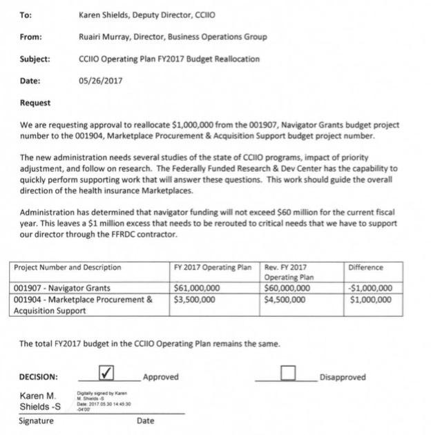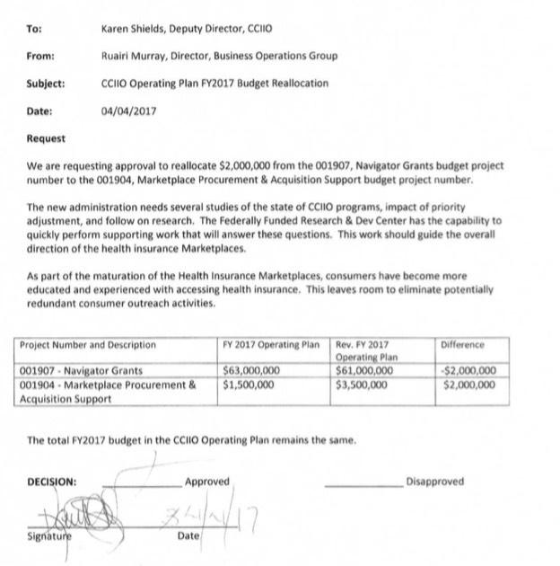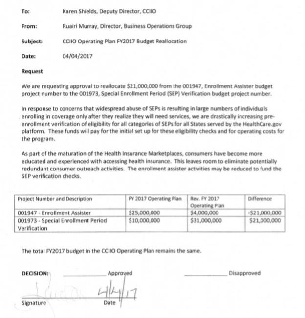 There's also an additional document semi-related to this issue: A fund transfer authorization memo cutting $21,000,000 from the Enrollment Assister program and applying it to the Special Enrollment Period Verification Program.
