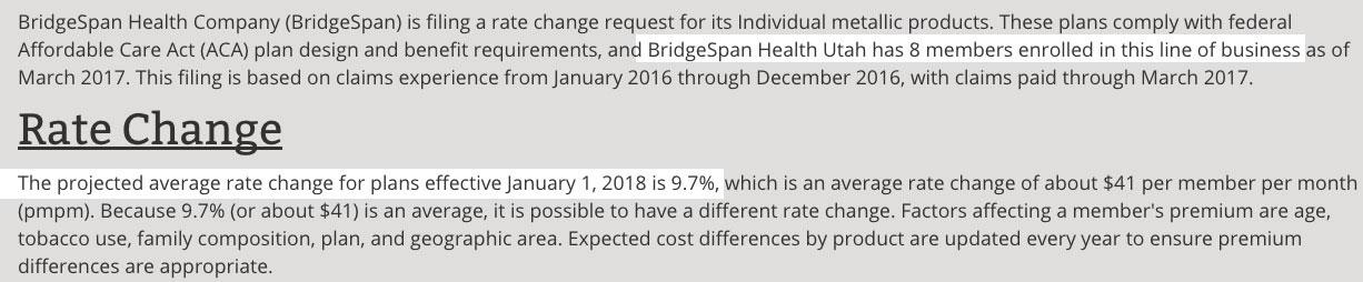 These are also the only two carriers which are impacted by the Cost Sharing Reduction issue, but it makes a pretty significant difference: Both SelectHealth and University of Utah specifically list CSR reimbursements as the primary reason for their rate hikes. They didn't give hard numbers, but according to the Kaiser Family Foundation, 15 points of the Silver rate hikes are due to CSRs; spread out across all metal levels, that translates into roughly 10.9%.