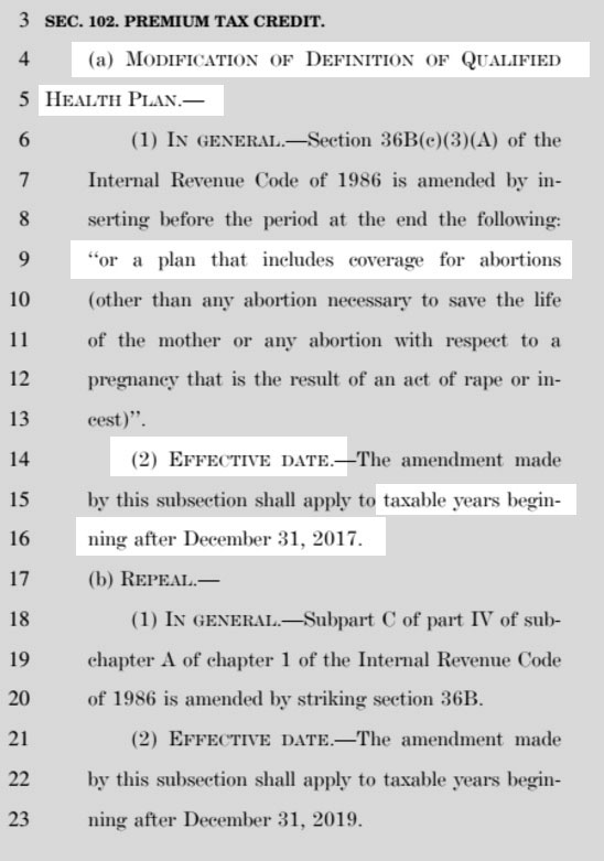 If the no-abortion provision popped up starting in 2020, it would suck but would also be pretty much moot since the premium tax credits are wiped out starting then anyway.