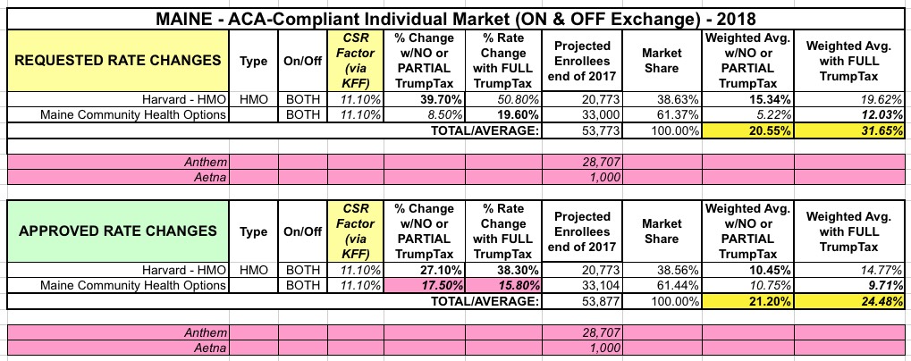 Assuming the other two carriers (Harvard Pilgrim and Maine CHO) stick around, this means around 29,700 Maine residents will have to shop around next year (Aetna dropped out earlier this year, but only had about 1,000 enrollees). However, it doesn't really change the average rate hike one way or the other, because Anthem's was about the same as the statewide average anyway (roughly 21% with CSRs, 25% without them).