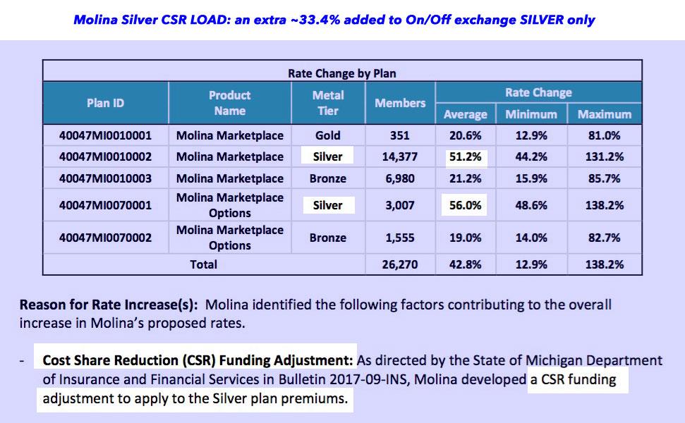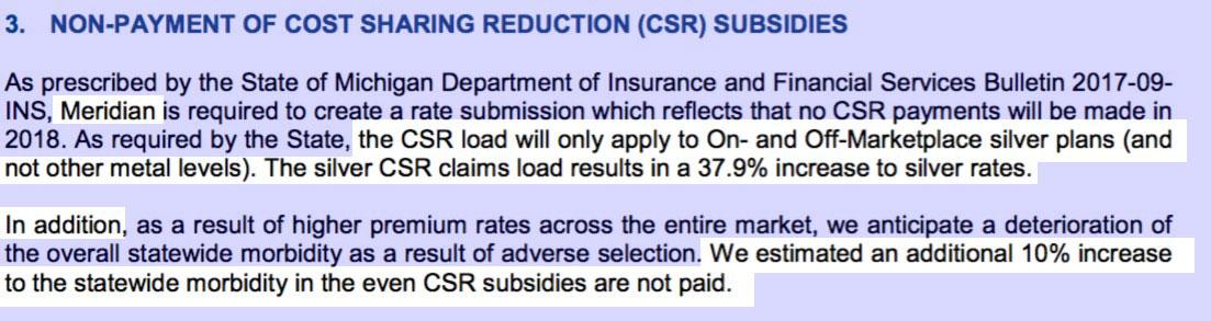 As in most states, the Michigan Dept. of Financial Services, seeing the potential writing on the wall, sent out a memo to all individual market insurance carriers instructing them to submit two different sets of rate filings for 2018: One assuming CSR payments would continue, the other assuming they won't: