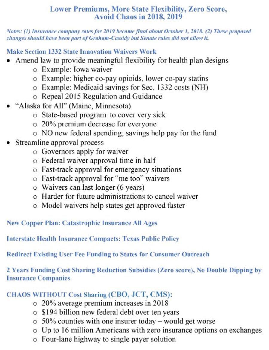 Huh. Authorization...but not appropriation. Reinsurance along the lines of the program launched in Alaska (and half like the one launched in Minnesota) is a critically important step towards stabilizing the markets...but again, the devil is in the details. If blue states or the Dems in Congress are gonna have to give up a pound of flesh every time reinsurance program funding is set to be appropriated, this could get tiresome and ugly really fast, but for the moment, it's better than nothing I suppose.