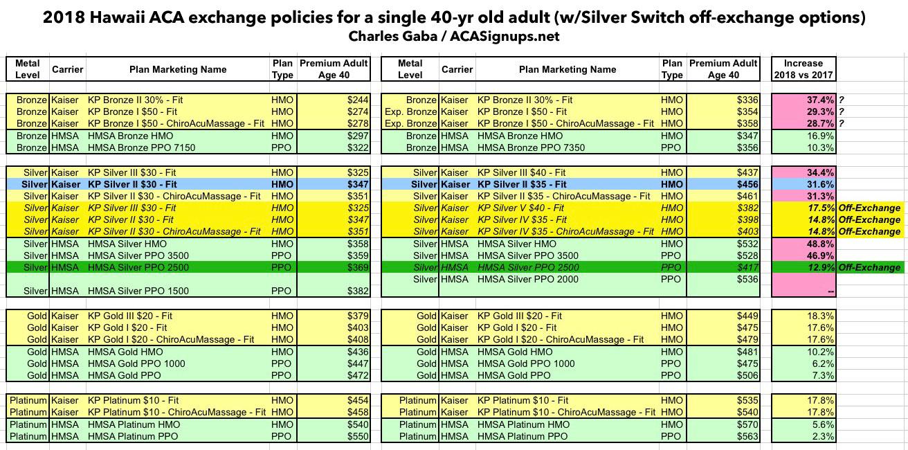 In practice, this doesn't mean much...subsidized enrollees can still get a hell of a deal on Gold plans from either Kaiser or HMSA; notice that one of the Gold plans ($449) costs less than the benchmark Silver ($456), while the other 5 from both carriers are only $19 - $50 more per month. Meanwhile, unsubsidized enrollees have the off-exchange Silver plans, which cost around $50/mo less (Kaiser) or ~$110/month less (HMSA) than their on-exchange equivalents.