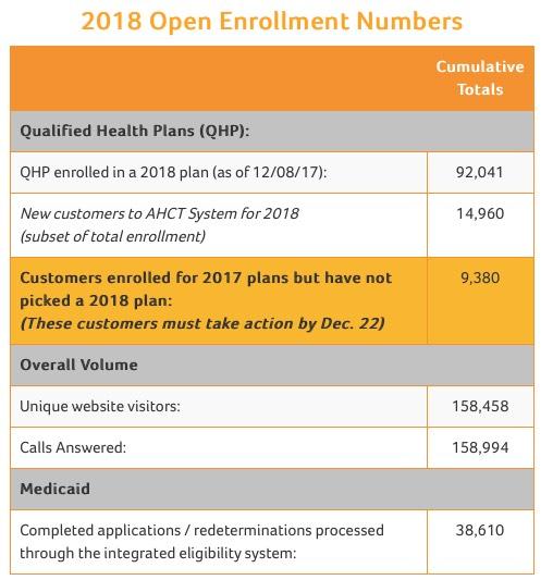 A small update out of Connecticut today; AccessHealthCT last reported just over 90,000 QHP selections as of November 30th, with 11,000 current enrollees who hadn't selected a 2018 policy yet. Today they've updated that to 92,041 QHPs as of this morning, leaving 9,380 left to renew.