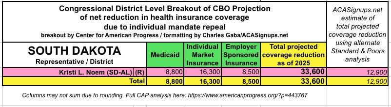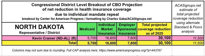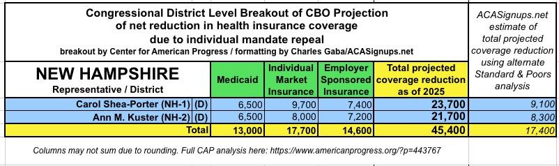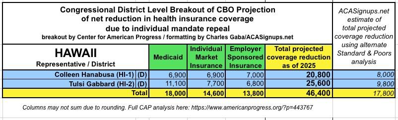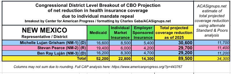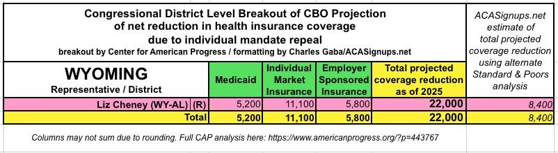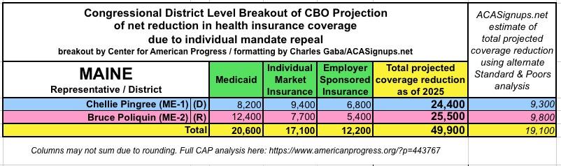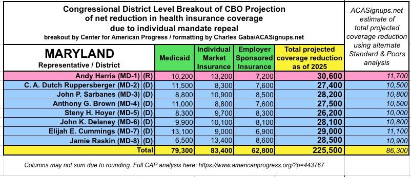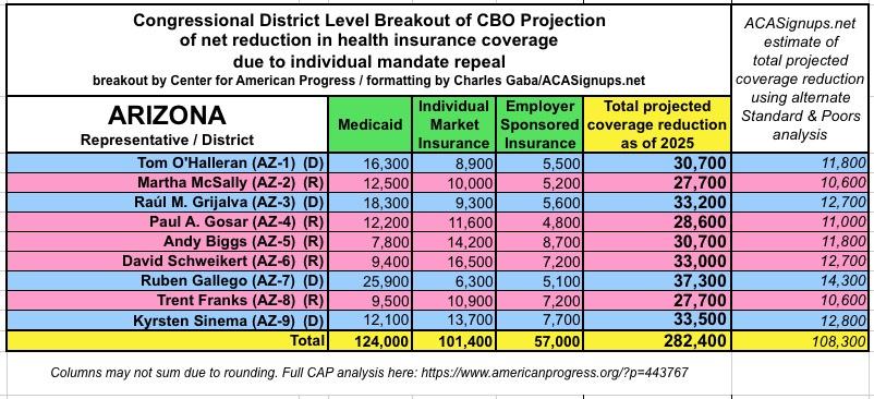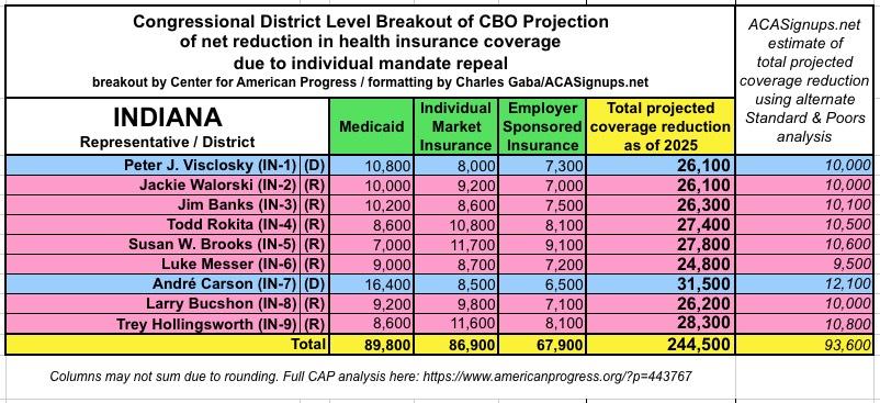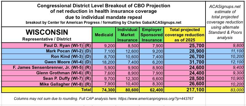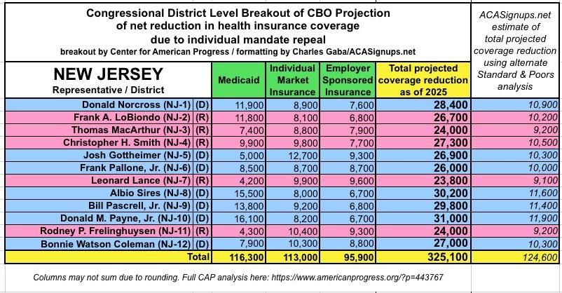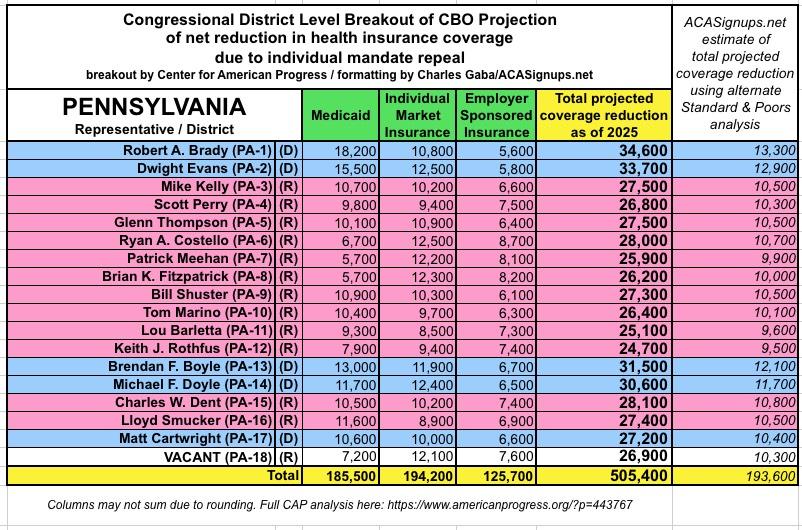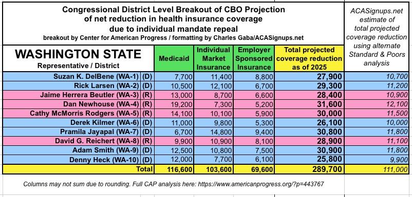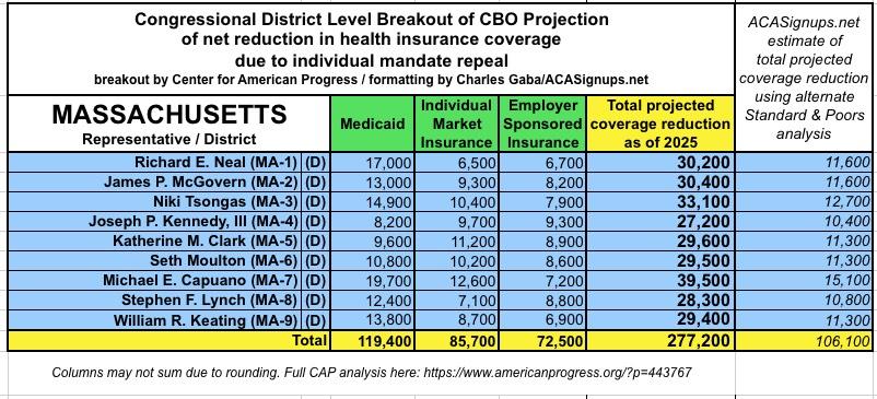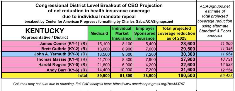 One more thing, however: In addition to the Congressional Budget Office projections, I've also included my own CD-level breakout of the lower coverage loss projections estimated by Standard & Poors. Unlike the CBO's 13 million projection, S&P estimates that only around 5 million people at most would lose coverage over the next several years if the ACA's individual mandate were to be repealed (without other significant changes to the law).