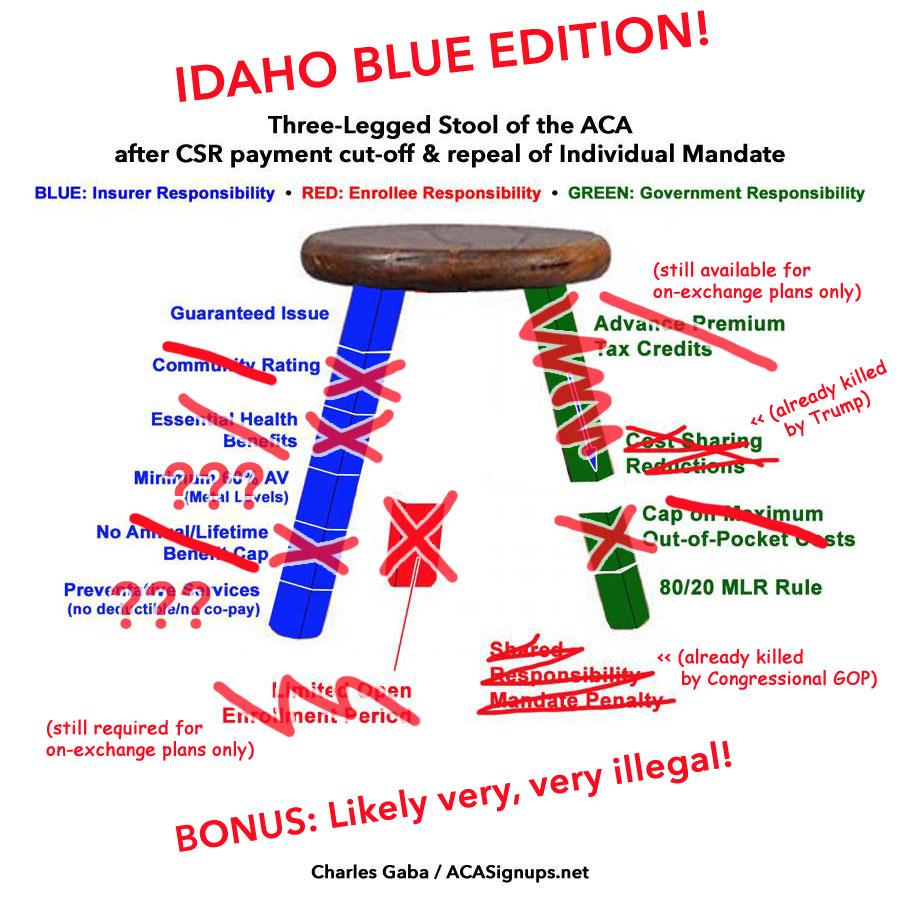This opens up another whole can of worms. Remember, 2018 premiums for ACA exchange policies are locked in through the end of this year. What happens if, say, 1/4 of the ~95,000 currently enrolled in ACA compliant plans via Your Health Idaho drop those policies and shift over to these new, non-compliant plans? The insurance carriers will lose 25% of their revenue, presumably from their lowest-cost enrollees...but without being able to increase their premiums to account for the massive shift until 2019. Some of them would likely take a massive bath for 9 months out of the year (remember, the new plans would kick into effect starting in April), just as many carriers had to eat a large loss for the last 3 months of 2017 when Trump pulled the plug on CSR reimbursement payments.