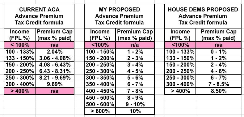 The summary sheet doesn't specify whether it proposes to raise the 400% FPL threshold (to, say, 600%?) or remove it completely, but either would be a major improvement. It also doesn't specify how much the credits would be increased, although it sounds like it would be along the lines of what I proposed last year. This would scratch both 7a and 7b off my list above.