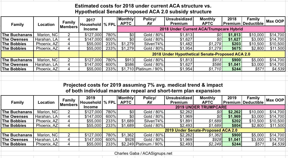 Here's a table summarizing the situation for all 3 families. It's important to note that the numbers shown in the frist table assume 2018 premiums, deductibles and MOOP figures...which means that the impact of the Mandate Repeal and proposed #ShortAssPlan sabotage is not reflected in either scenario (nor is the expected ~7%/year normal medical inflation trend).