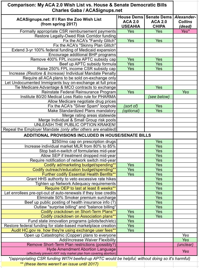 In any event, now that the Republican "ACA stabilization bill" (Alexander-Collins) appears to be dead and buried, I figured it might be helpful to line up both the House and Senate versions of the ACA 2.0 bills to see how they compare to each other as well as to my own list of recommendations.