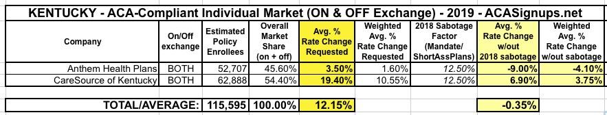 Kentucky: Preliminary 2019 #ACA rate hike request: +12.2% WITH #ACASabotage, est. -0.4% *without* #ACASabotage