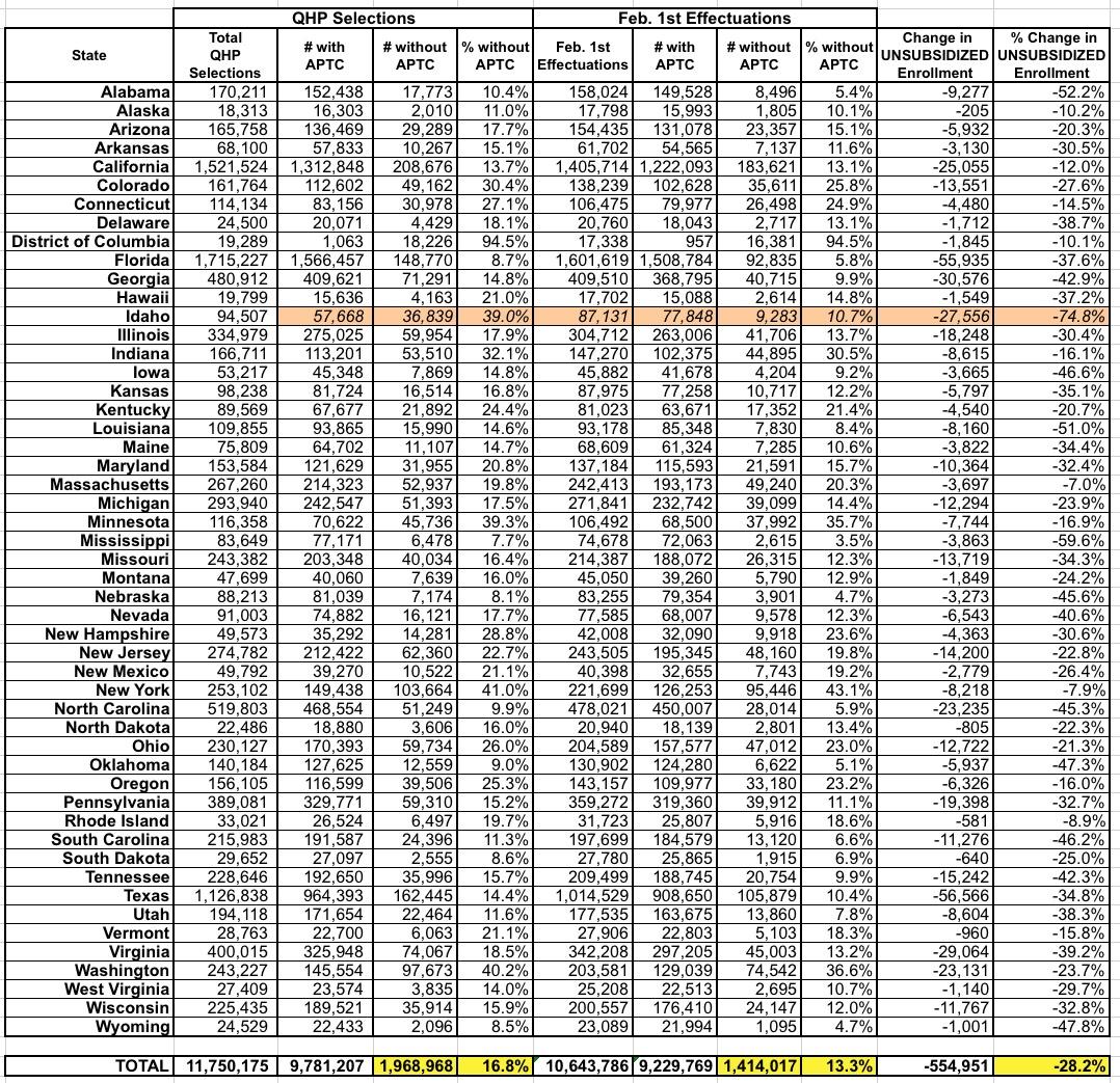 If you subtract them from the February-start total, you get a 91.1% payment rate for those who started coverage in either January or February. In other words, I was right all along. Note that this rate varies widely, from as low as 81% in New Mexico to as high as 97% in Alaska. Why? I'm sure there are various reasons depending on the specific demographics, plan offerings, networks and so forth in each state.