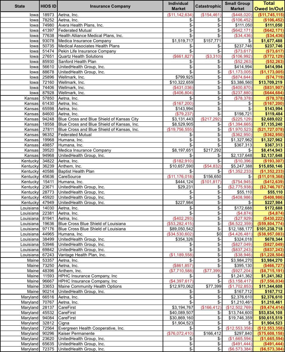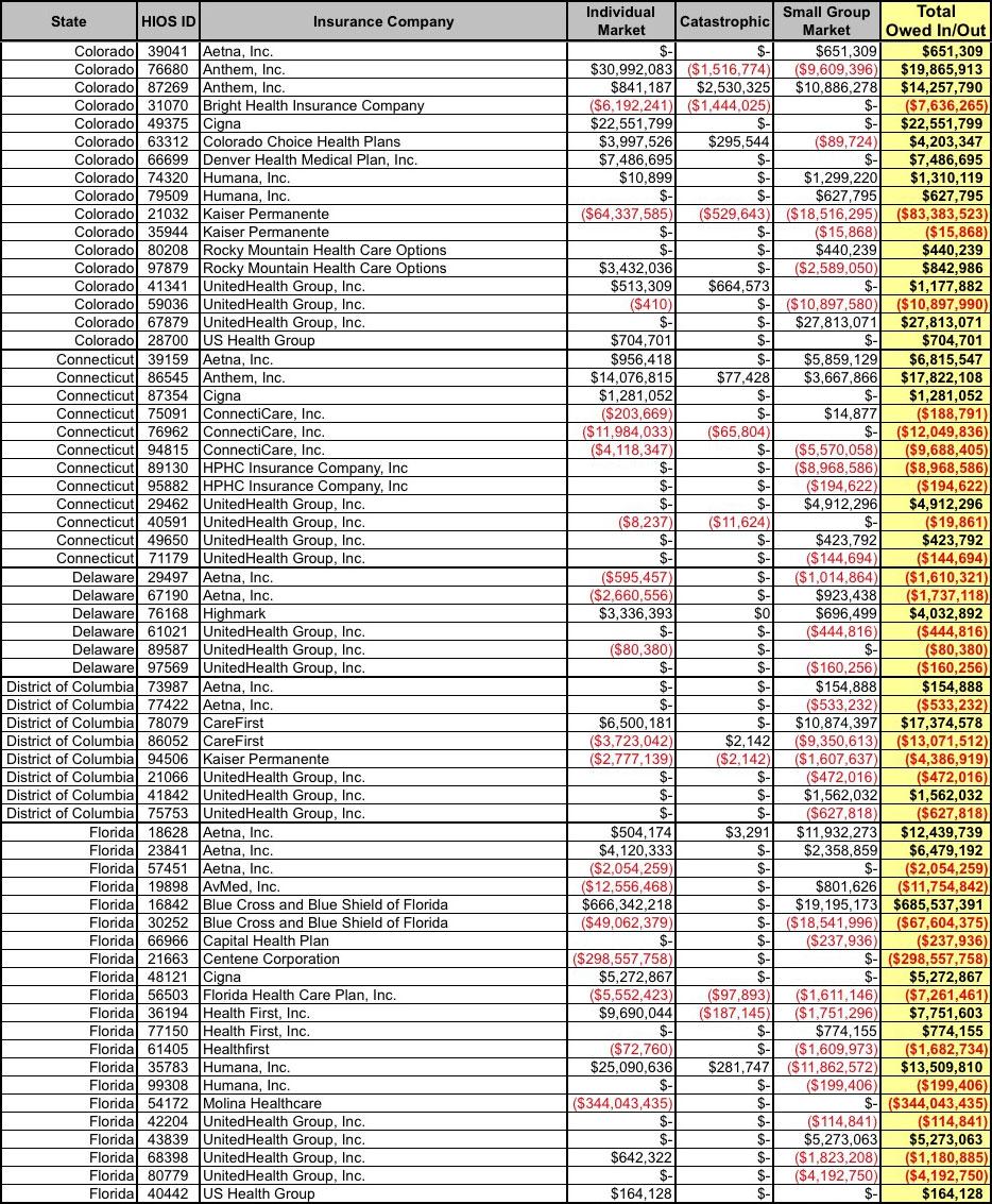 So, about an hour ago, CMS released the actual 2017 RA report itself, which lists (among other interesting info), exactly how much money insurance carriers in every state owe or are owed from last year. There are three categories: The Individual Market (Bronze, Silver, Gold & Platinum); the Catastrophic Individual Market; and the Small Group Market. the total amount of money involved is around $10.4 billion ($5.2 billion owed by carriers, $5.2 billion owd to carriers).