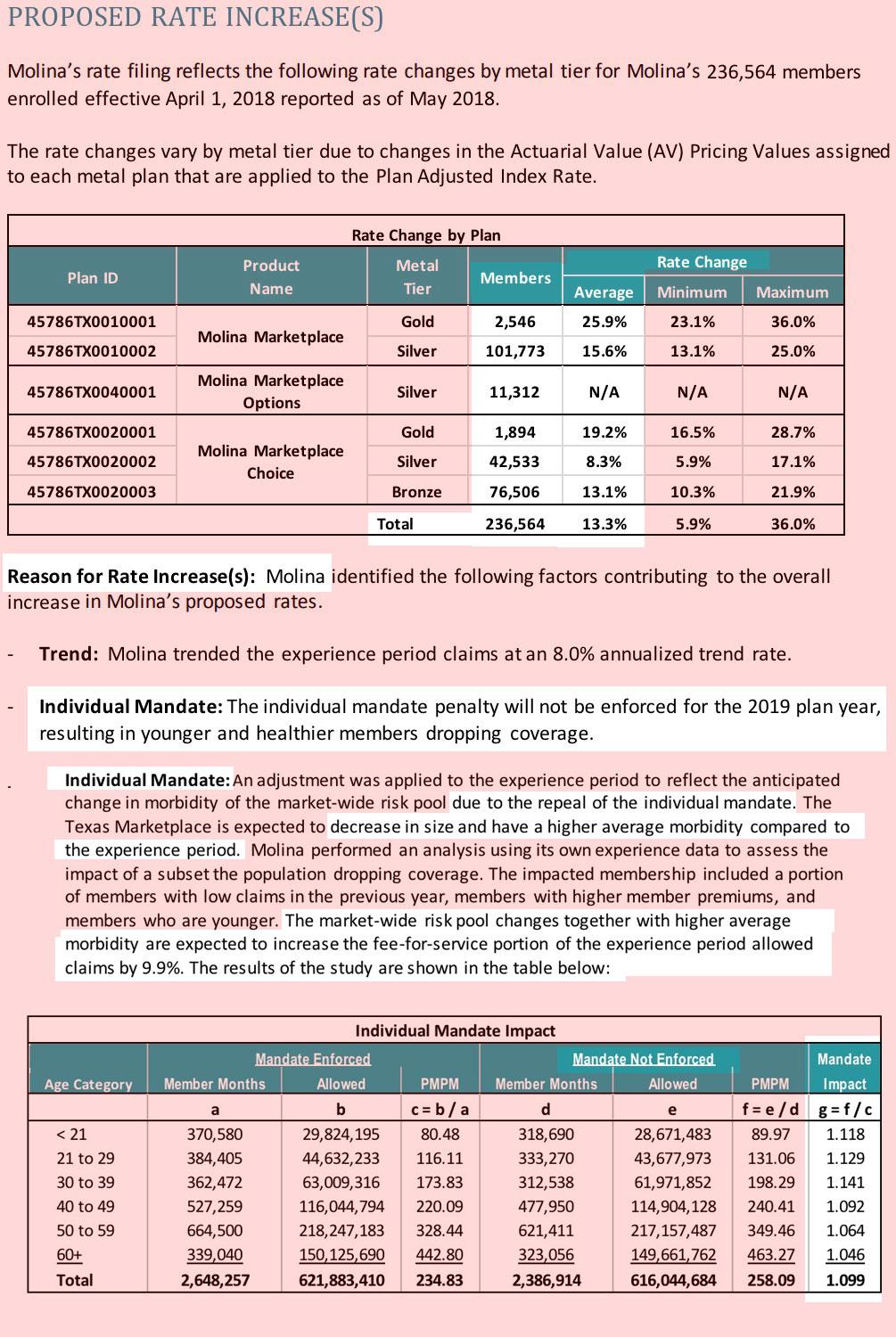 UPDATE: Thanks to Louise Norris for the heads up: Molina's Texas filing has been uploaded as well (see below), and is very specific: 236,000 current enrollees, a 13.3% average rate increase requested, and 9.9% of it is due specifically to the individual mandate being repealed. With Molina added to the mix, about 35% of Texas's total individual market is accounted for, with an 11.1% average increase with sabotage factors and a virtually FLAT average without it.