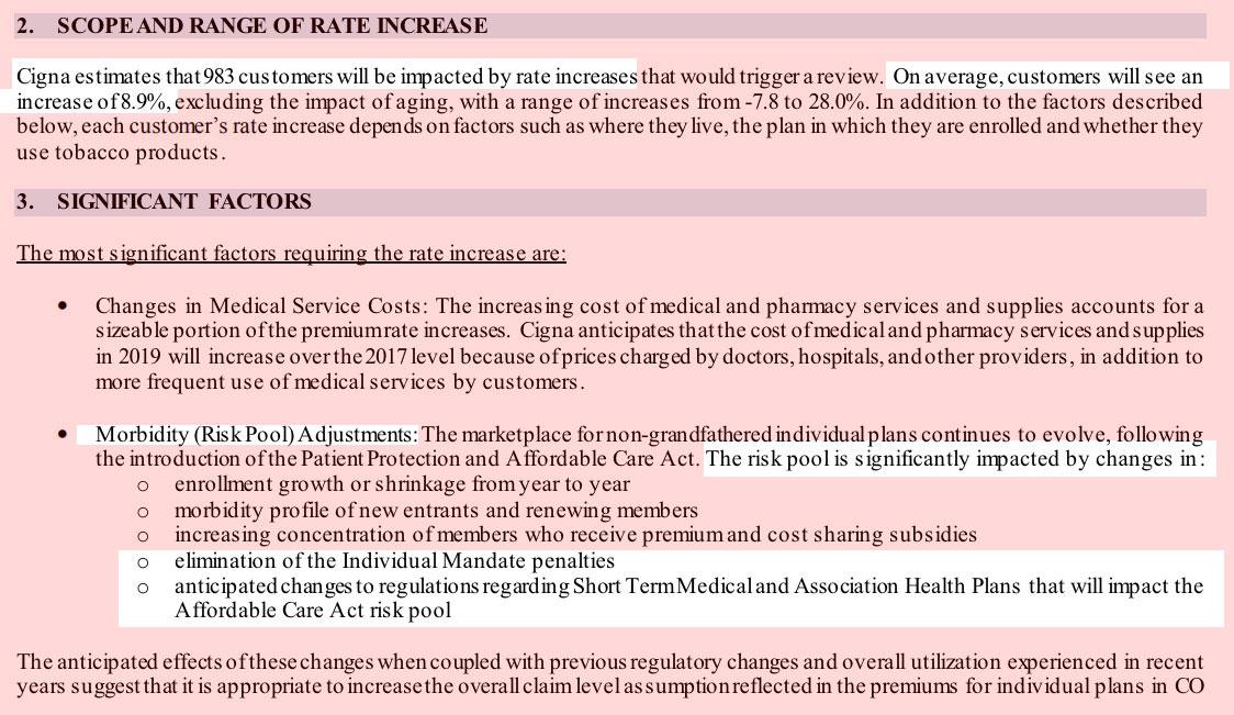 As you can see below, I don't have the hard enrollment numbers for some of the carriers, but the state insurance division has already done the weighted average calculation for me (5.94%). Several of the carriers specified how much they're raising rates due specifically to mandate repeal and/or #ShortAssPlans being expanded (10 points for HMO Colorado/Anthem and Rocky Mountain HMO, just 3.7 points for Friday Health Plans). The others didn't specify the impact, but most do mention it as a significant factor on rate hikes.