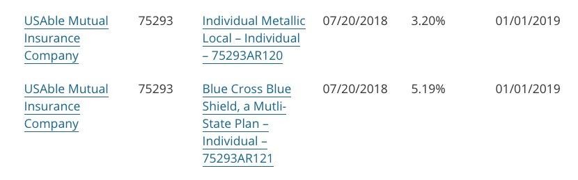 Arkansas has three carriers offering ACA individual market policies, but one of them is kind of/sort of split into two separate entities (QualChoice and QCA). Unfortunately, most of the key actuarial memo content has been redacted, so I'm missing data on market share for three of the four entries--Ambetter/Celtic is the only one which states outright their current enrollment number. For the other three I had to estimate based on last years data. For QCA and USAble (which is actually Blue Cross Blue Shield, for some reason), I had to sort of split the difference between the different entries to get the overall requested rate increases.