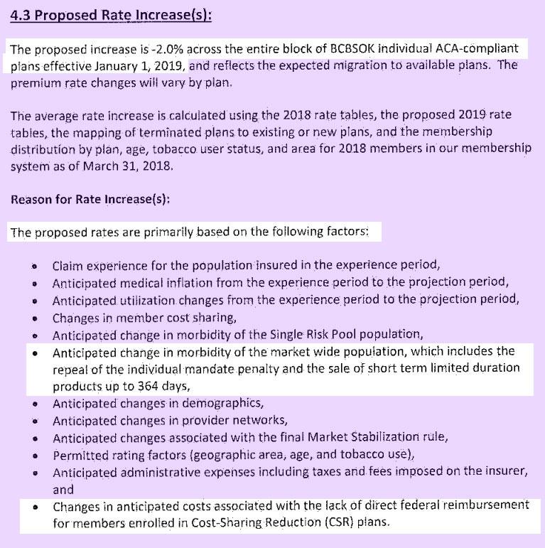 The Urban Institute projected an 18.4% rate increase due to #MandateRepeal and #ShortAssPlans. BCBSOK doesn't go into specifics about the impact, but does list both of these as significant factors. Knocking 1/3 off this projection gives around 12.4%.