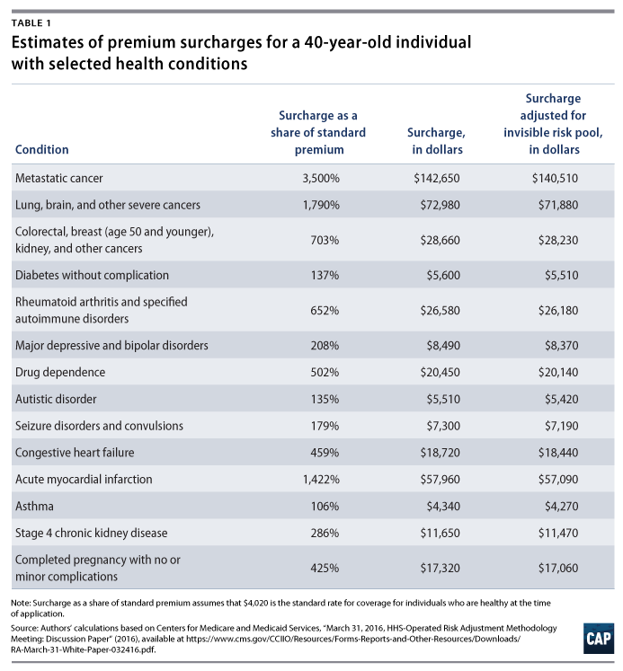 How much more might coverage for those conditions cost under the AHCA? Well, the Center for American Progress crunched the numbers last year, shortly before House Republicans passed the bill, and came up with the following estimates for various common types of pre-existing conditions: