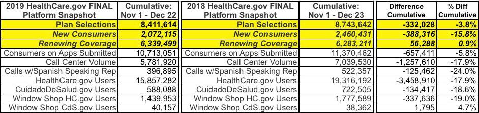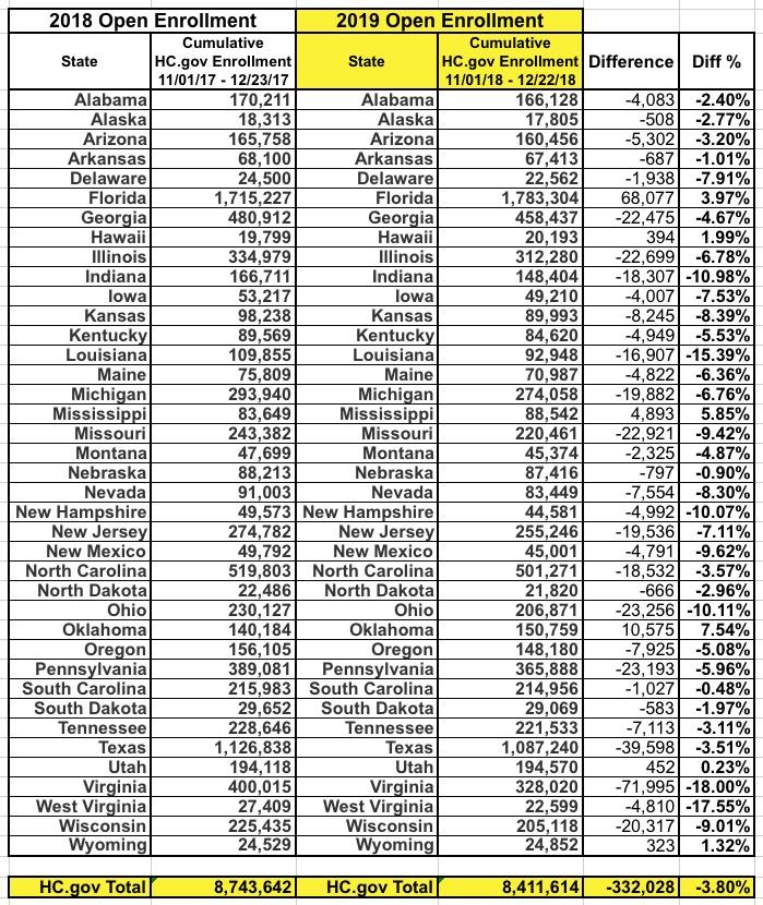 As I warned back on December 19th when CMS released the Week 7 HealthCare.Gov Enrollment Snapshot Report, the final, official enrollment tally for the 2019 Open Enrollment Period was almost certain to end up slightly lower than the Week 7 cumulative numbers indicated. There are several reasons for this: Some people who were auto-renewed contact HC.gov to cancel their 2019 renewals, while others had their enrollments involuntarily denied or otherwise cancelled due to problems with verifying their identity, address or legal residency status.