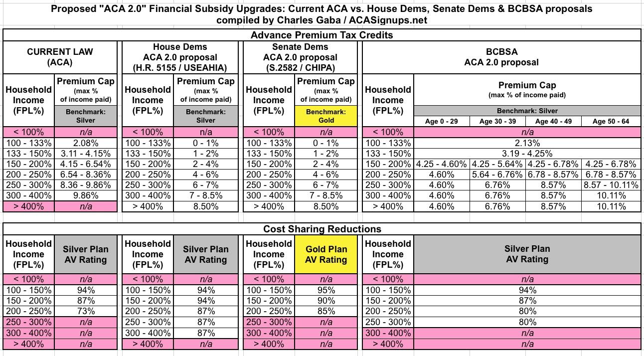 I took a look at BCBSA's proposal itself and there are some interesting differences between what they're proposing and what can be found in the House and Senate ACA 2.0 bills. Here's a side-by-side comparison of just the proposed Advance Premium Tax Credits (APTC) and Cost Sharing Reduction (CSR) formulas in each: