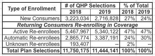 [4] As in prior years, consumers with coverage at the end of 2018 who did not make an active selection were generally automatically re-enrolled for 2019. When consumers had 2019 Exchange plans available to them from their 2018 issuer, they were automatically re-enrolled into the same plan as 2018 or a different plan from the same issuer; depending on the Exchange, they could also be automatically re-enrolled into a suggested alternate plan from a different issuer.