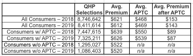 - Financial Assistance: Eighty-seven percent of consumers in states that use the HealthCare.gov platform received APTC in the 2019 OEP, compared to 85 percent in the 2018 OEP; the average premium after application of APTC for these consumers was $87 in the 2019 OEP, compared to $89 in the 2018 OEP.