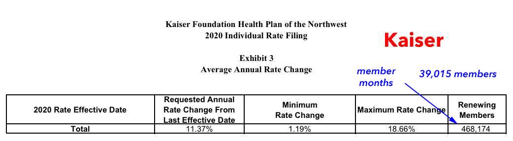 UPDATE: I originally had the average skewed way too high because of what seemed to be a massive number of Kaiser enrollees (over 468,000, which is several times larger than Oregon's entire individual market!). However, it turns out that was member months, not members...you have to divide by 12 to get the correct number. Once I did that, the rest falls into place. I still get a slightly higher statewide average of 3.43% vs. the 3.3% noted in the press release, but this is pretty typical due to slight variances in numbers and percentages reported in different filing forms from different dates, etc.