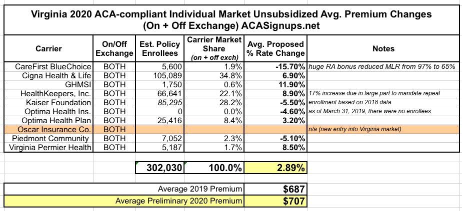 The extended VA deadline passed last week, however, and so I'm now able to dig up the preliminary 2020 rate filings for the ACA market. It's important to remember as always that these are preliminary requests only; some of them are bound to change at least once between now and late September, when the final rate changes are locked in and the contracts are signed for the 2020 calendar year (and Open Enrollment Period).