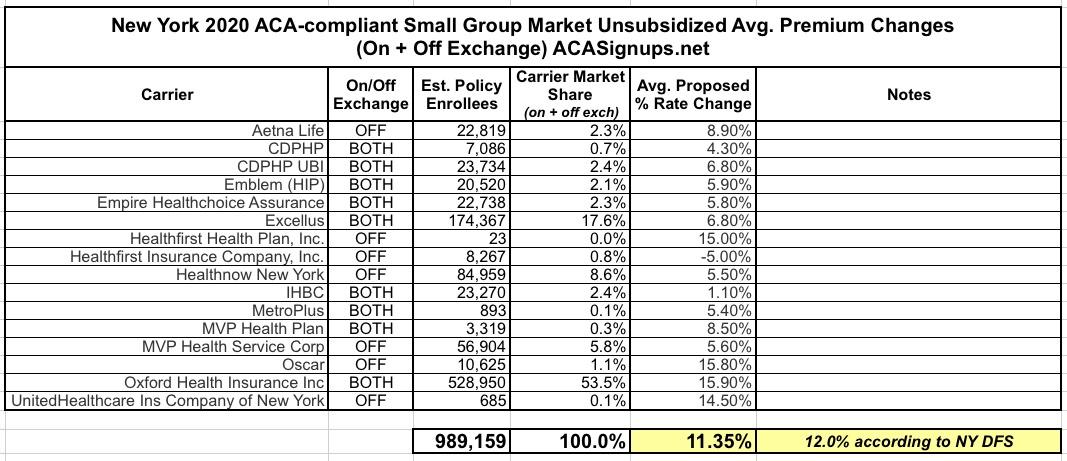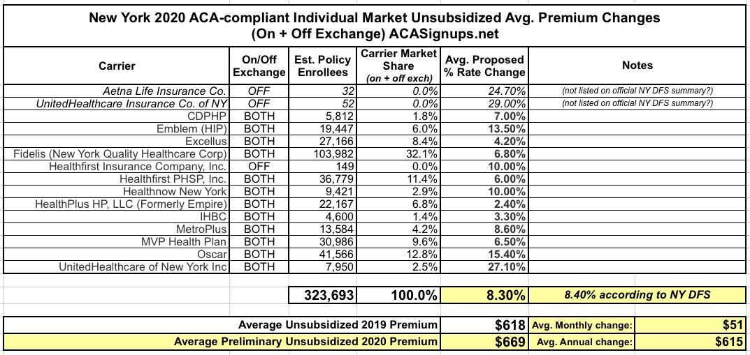 I end up with a slightly lower weighted average (8.3% instead of 8.4%), but there's several factors which could cause that including rounding etc. There's actually two other carriers which have pending 2020 rate filings on the Indy market which NY DFS didn't list at all in their summary (Aetna and UHC Insurance Co. of NY, which is separate from UHC of NY), but the two of them only have 84 people enrolled combined so are non-factors anyway...I'm assuming they're closed to new enrollees and are being phased out? In any event, New York's total ACA-compliant individual market is around 324,000 people. Assuming effectuated enrollment on-exchange was 90% of the total OEP QHP selections as of the end of March, that's around 245K on-exchange and 79K off-exchange.