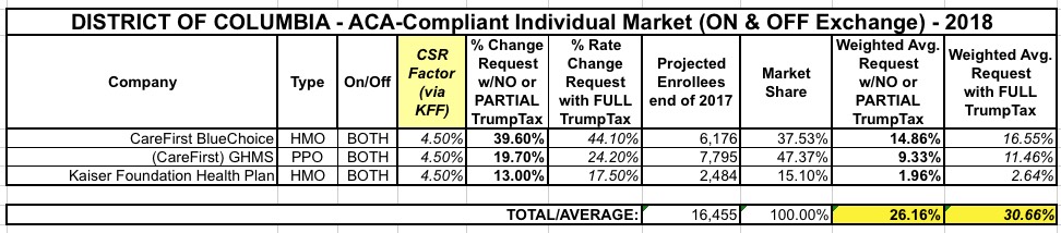 The District of Columbia is the 6th state (OK, it's not a state but it's considered one legislatively for purposes of the ACA) to post their initial 2018 rate filings (h/t to Louise Norris for the heads up). For 2017, the weighted average rate increase for the individual market was a mere 7.3%, highly unusual for this year, while the small group market increase was almost non-existent: Just 0.4% overall.