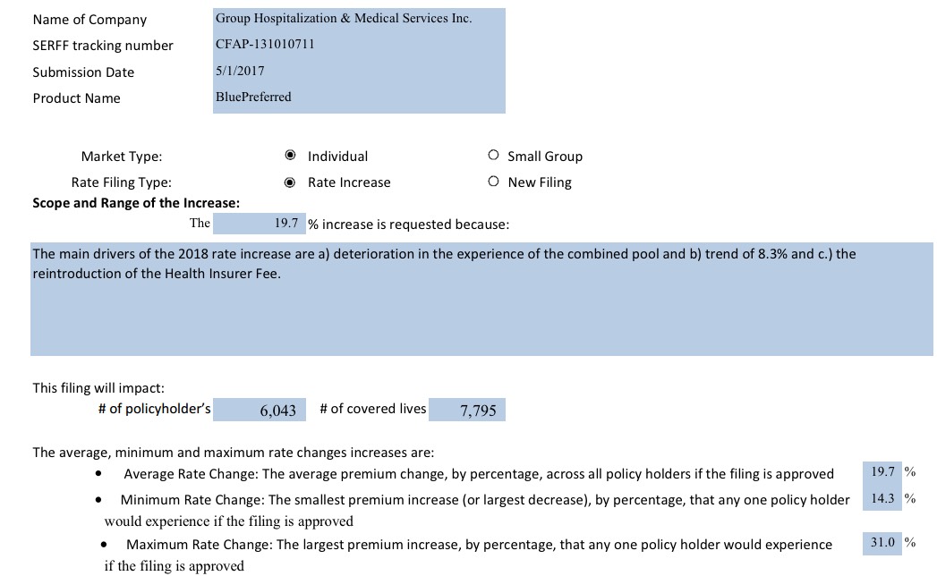 It's important to note, again, the impact that uncertainty about things like CSR reimbursements, enforcement of the individual mandate penalty and so forth by the Trump administration are having on these rate increase requests. Note that "increased morbidity" is listed as the number one factor in these hikes on the individual market by CareFirst...which is also asking for the highest rate increases.