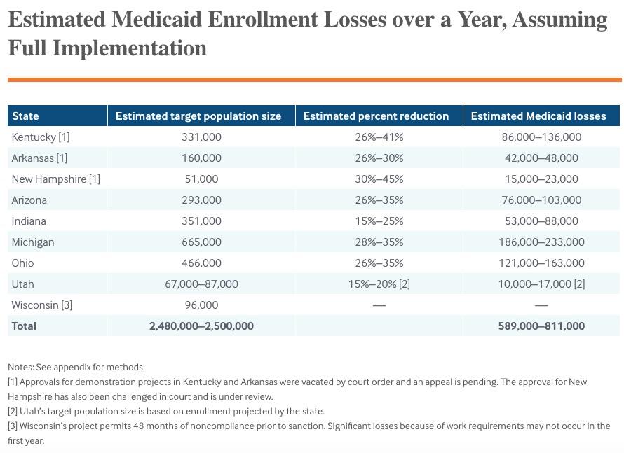 If these projects are fully implemented, we estimate that approximately 589,000 to 811,000 people would lose their Medicaid coverage after 12 months. This amounts to about one-quarter to one-third of the 2.5 million people who would be subject to the new rules, and includes 128,000 to 184,000 just in Kentucky and Arkansas combined. These are losses only associated with the work requirements and do not account for other elements like monthly premiums or new paperwork requirements that may trigger additional losses.