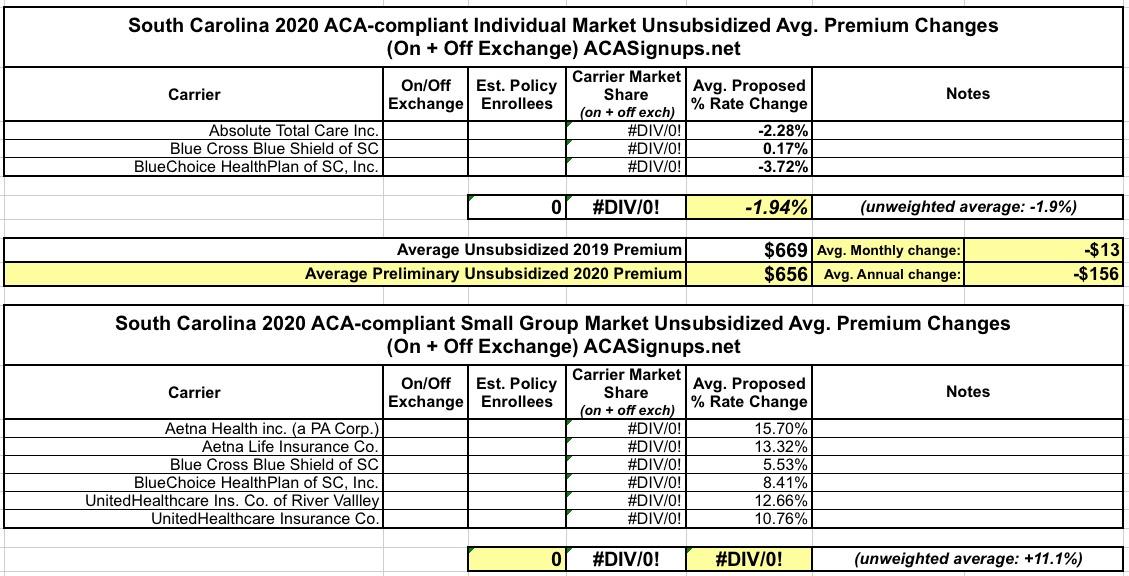 South Carolina: *Preliminary* (unweighted) avg. 2020 #ACA exchange premiums: 1.9% reduction