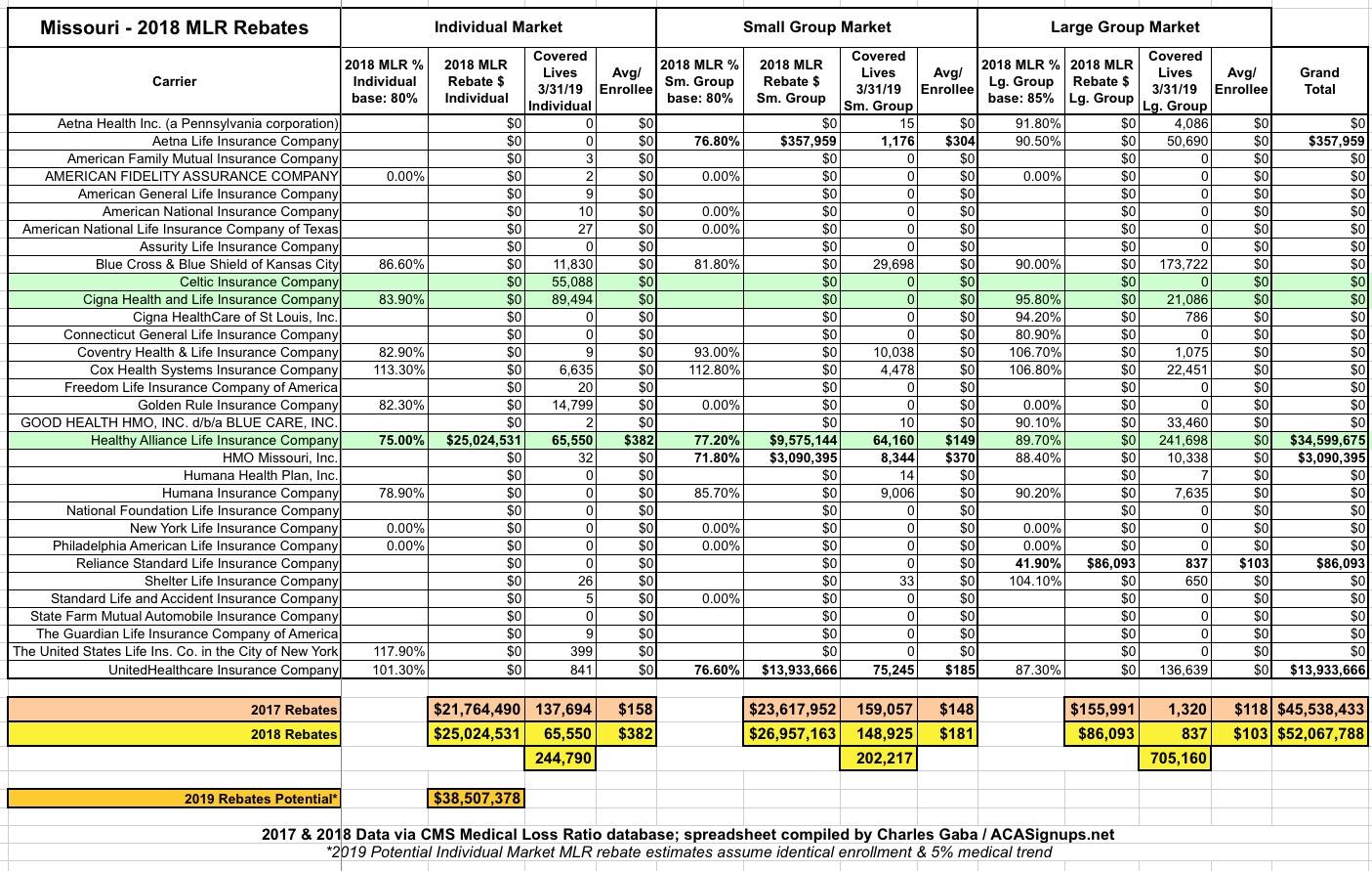 AGAIN: There's absolutely no guarantee that things will play out this way. It's possible that none of these carriers will make MLR payments next year, or only some of them will, or the amounts will be smaller. These 2019 projections are pure speculation on my part based on a number of big assumptions.
