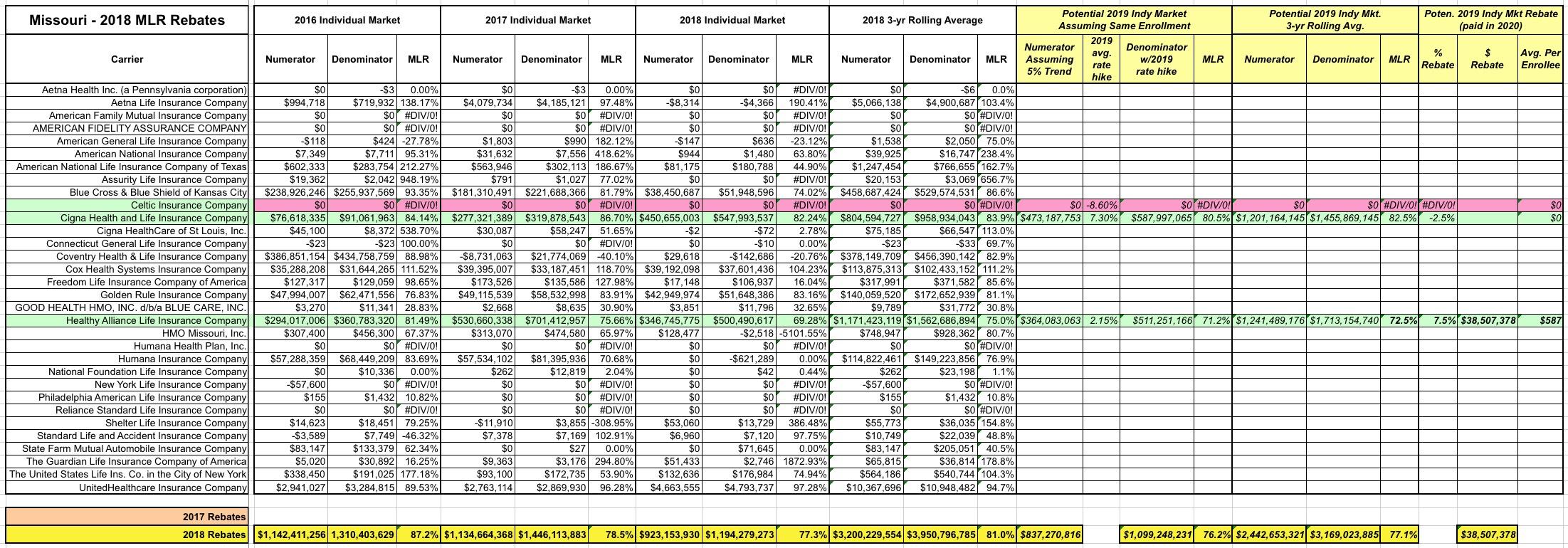 Missouri's total rebate amounts aren't that different from last year...but the average rebate for Individual Market enrollees is more than twice as high: 65,000 enrollees will receive over $25 million in MLR rebates, averaging $382 apiece from Healthy Alliance.