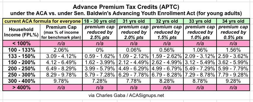 Under Baldwin's proposed bill, a 30-year old would have thier premium cap reduced by 2.5 percentage points, to 5.43% of income. That's just $1,69/year or $136/month, boosting their subsidies by $62/month. From 31 - 34 years old that 2.5 point reduction would drop off a half a point at a time, like so: