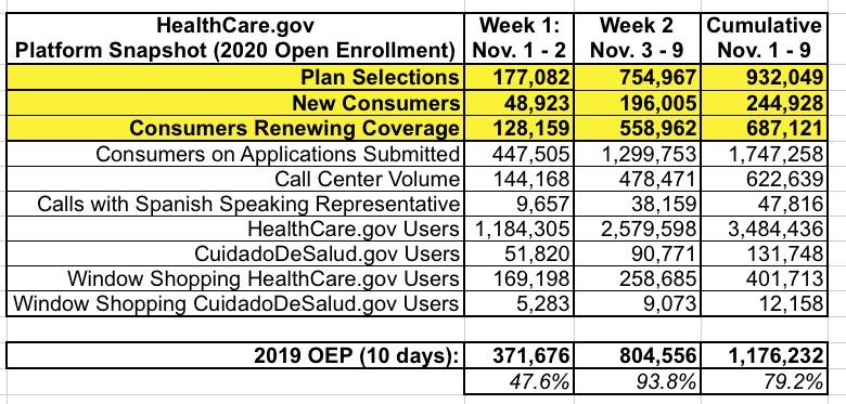That one missing day will become less relevant as each week passes, but even if you assume it accounts for 100K of the shortfall and knock off another 1% to account for Nevada splitting off onto their own exchange, that still leaves 2020 running around 11% (132,000 QHP selections) short of last year for now.