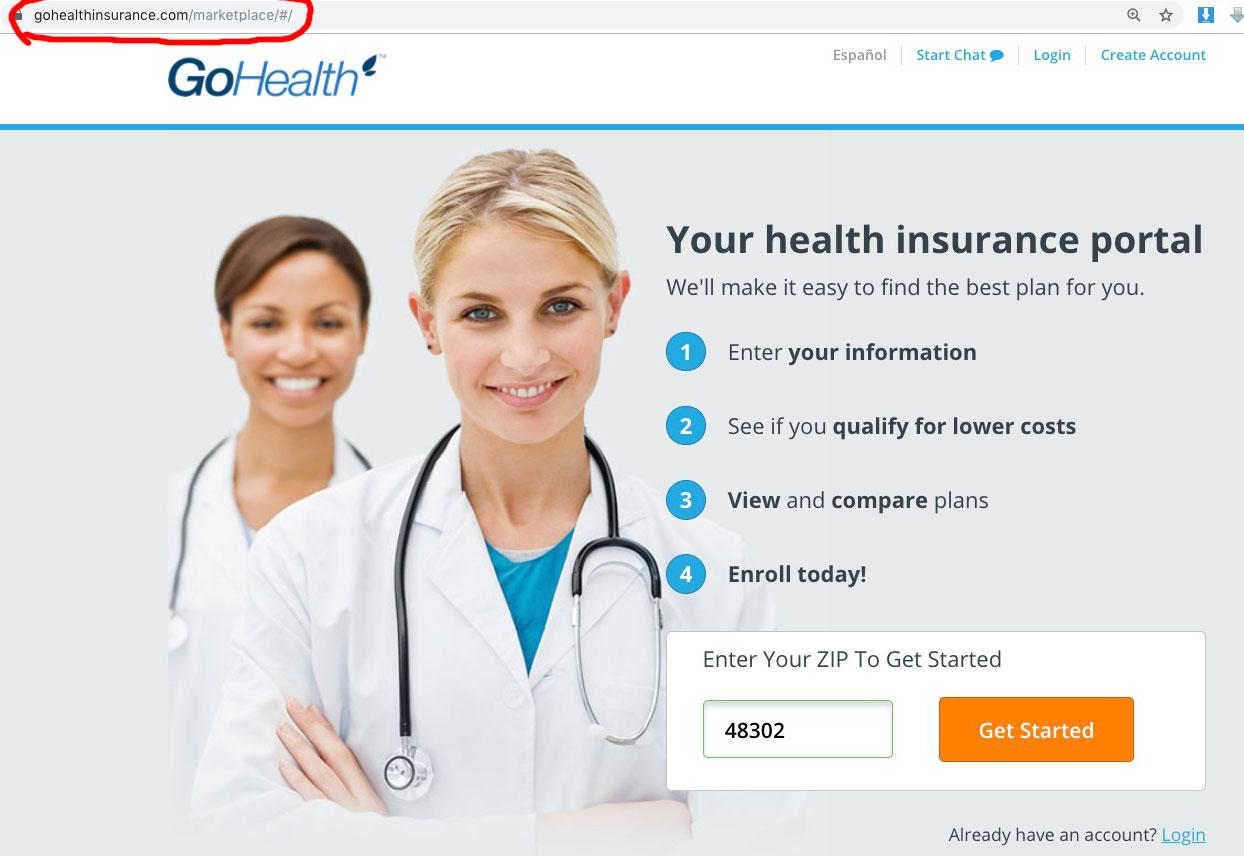 I'm gonna use GoHealth as an example here. First, clicking on the link doesn't take you to their regular home page...instead, it takes you to a more generic "portal" page where you're immediately asked to plug in your information: