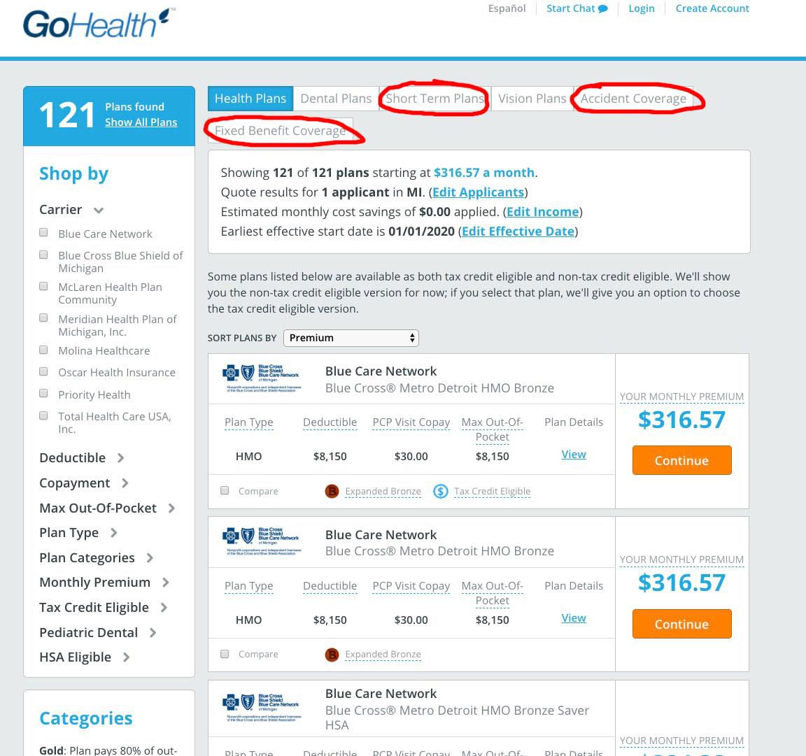 Note: You can enroll in ACA-compliant policies directly via the insurace carrier's website as well, but the only way to be eligible for ACA tax credits is if you enroll on-exchange. That's the other reason I strongly recommend using one of the above websites.