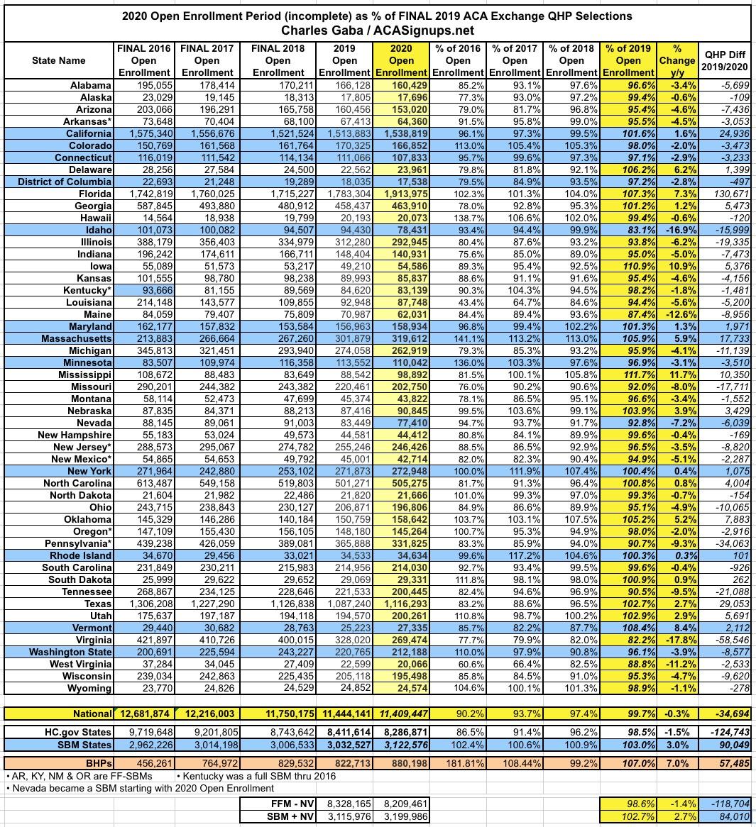 I noted this a couple of weeks ago, but I'm updating this post because the official CMS 2020 Open Enrollment Period report has just been released, so I have final numbers for every state now.
