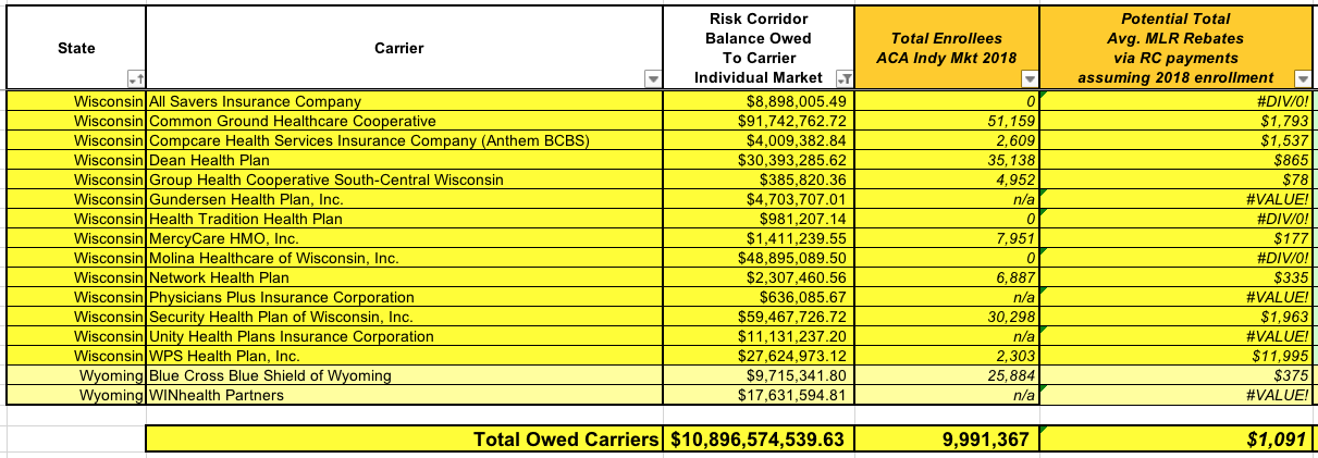 But what about a carrier which mostly dropped out of the individual market but not quite? I'm talking about carriers which are owed millions of dollars in Risk Corridor payments but only have a small number of actual individual market policyholders to divide it up amongst?