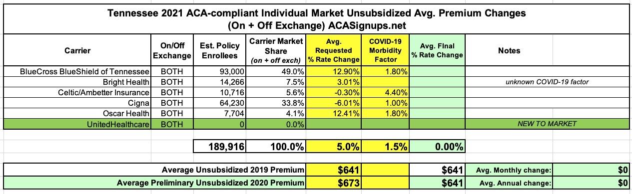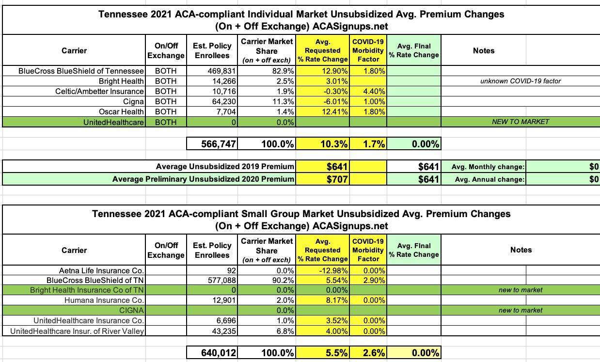 Tennessee: Preliminary avg. 2021 #ACA premiums: +5.0% indy market, +5.5% sm. group