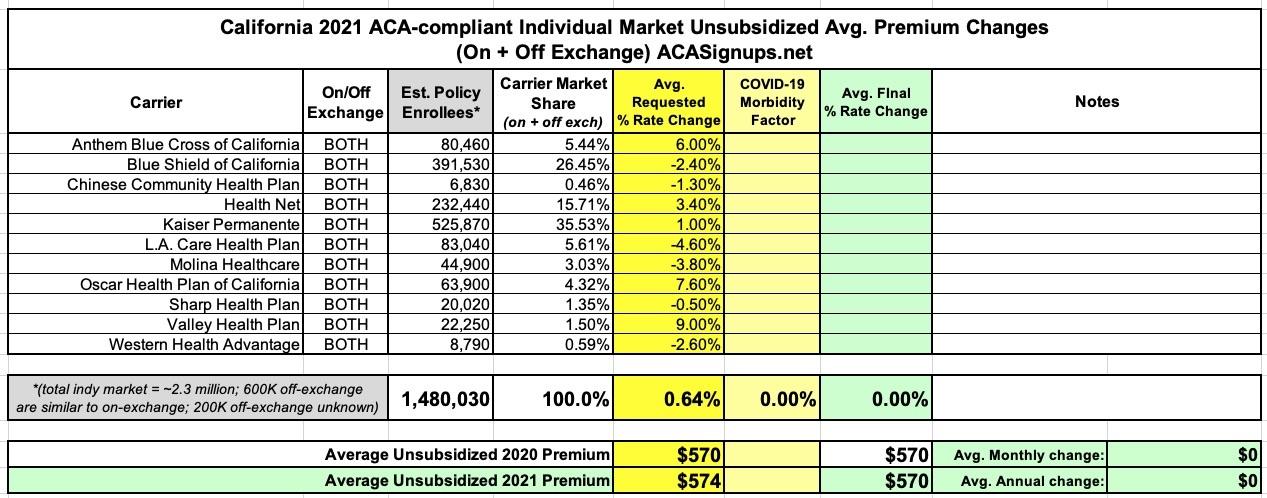HOWEVER, I asked about this during the CoveredCA webinar a few moments ago and Peter Lee (CoveredCA executive director) stated that around 3/4ths of those 800K (roughly 600K) are enrolled in "mirrored" ACA plans which are identical to the on-exchange plans and should be very similar in breakout in terms of average rate changes/etc. The other 200K enrollees are in non-standard off-exchange plans which they haven't really looked at yet, but it sounds like the overall weighted average including all 2.3 million should still be pretty close to 0.6%: