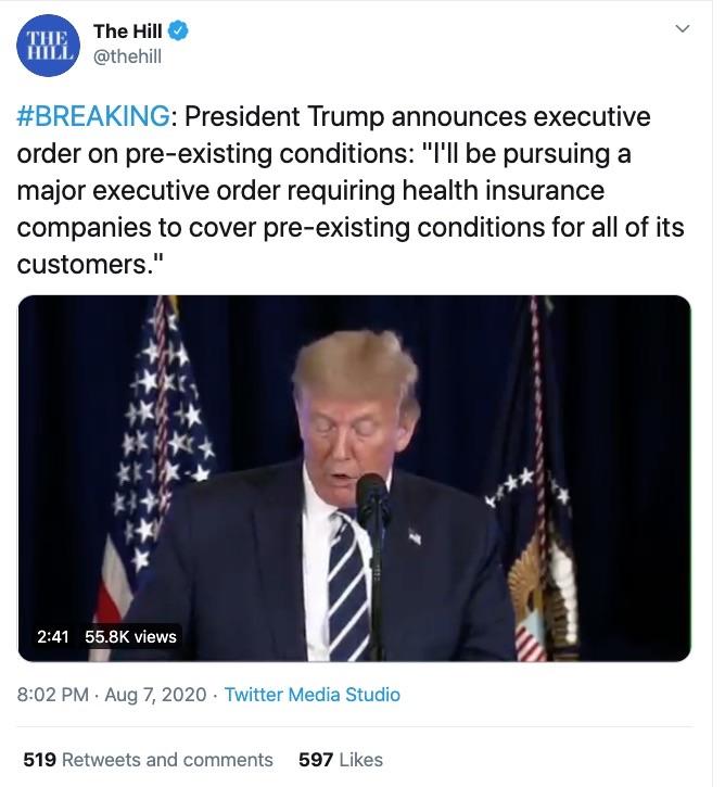 ANY reporter/media outlet which reports/tweets about Trump's XO "ordering" insurance companies to "cover pre-existing conditions" without mentioning that THE ACA ALREADY DOES THIS and TRUMP IS SUING TO STRIKE DOWN THE ACA is guilty of journalistic malpractice.