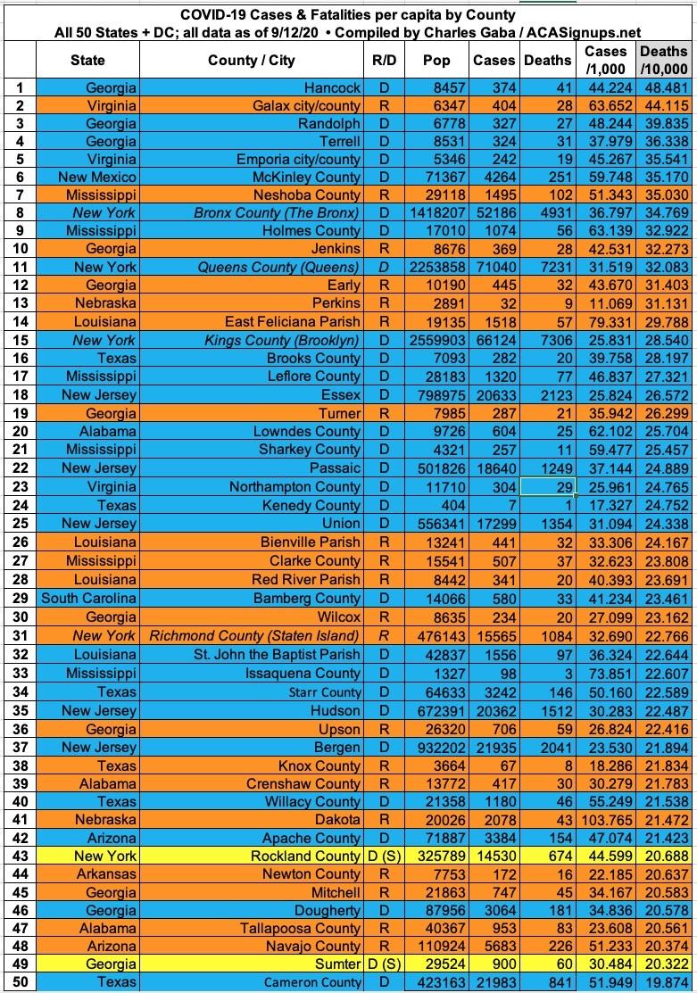 Here's the top 100 counties ranked by per capita COVID-19 fatalities as of Saturday, September 12th (click image for high-res version):