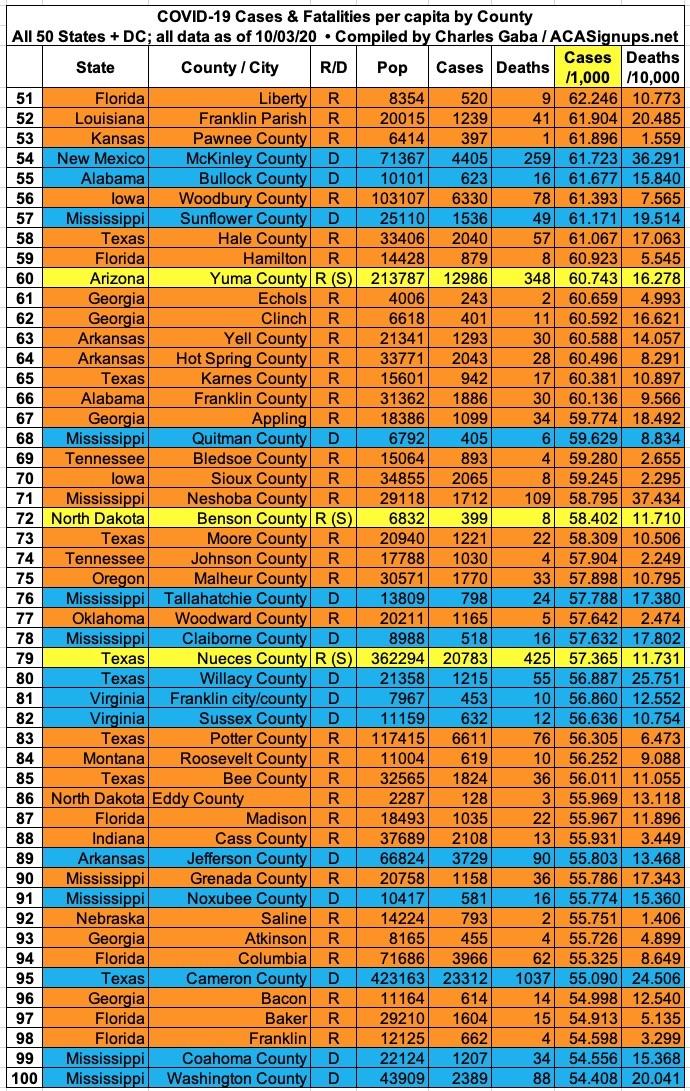 With these updates in mind, here's the top 100 counties ranked by per capita COVID-19 cases as of Saturday, October 10th (click image for high-res version). Blue = Hillary Clinton won by more than 6 points; Orange = Donald Trump won by more than 6 points; Yellow = Swing District