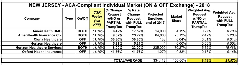 UPDATE 6/9/17: MAINE ADDED and CONNECTICUT CORRECTED. There are now 10 STATES representing 18.8% of the total population included, with a weighted average requested rate hike of 13.1% WITHOUT the Trump Tax or 34.2% WITH it.