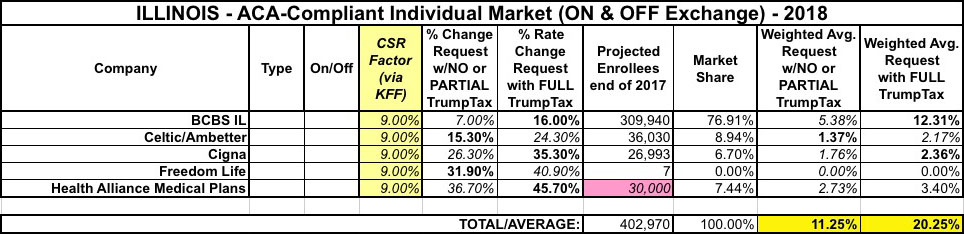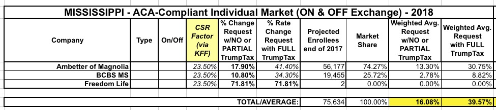 UPDATE 6/02/17: OK, between North Carolina (60% due specifically to sabotage) and Pennsylvania (75% due specifically to sabotage), I'm bumping my ballpark average assumption up to a flat 50% due to the "Trump Uncertainty Tax" in states which don't otherwise specify the impact. I've also added new columns to the tables below which compare the total rate hike requests vs. what they likely would be without the Trump Tax included.