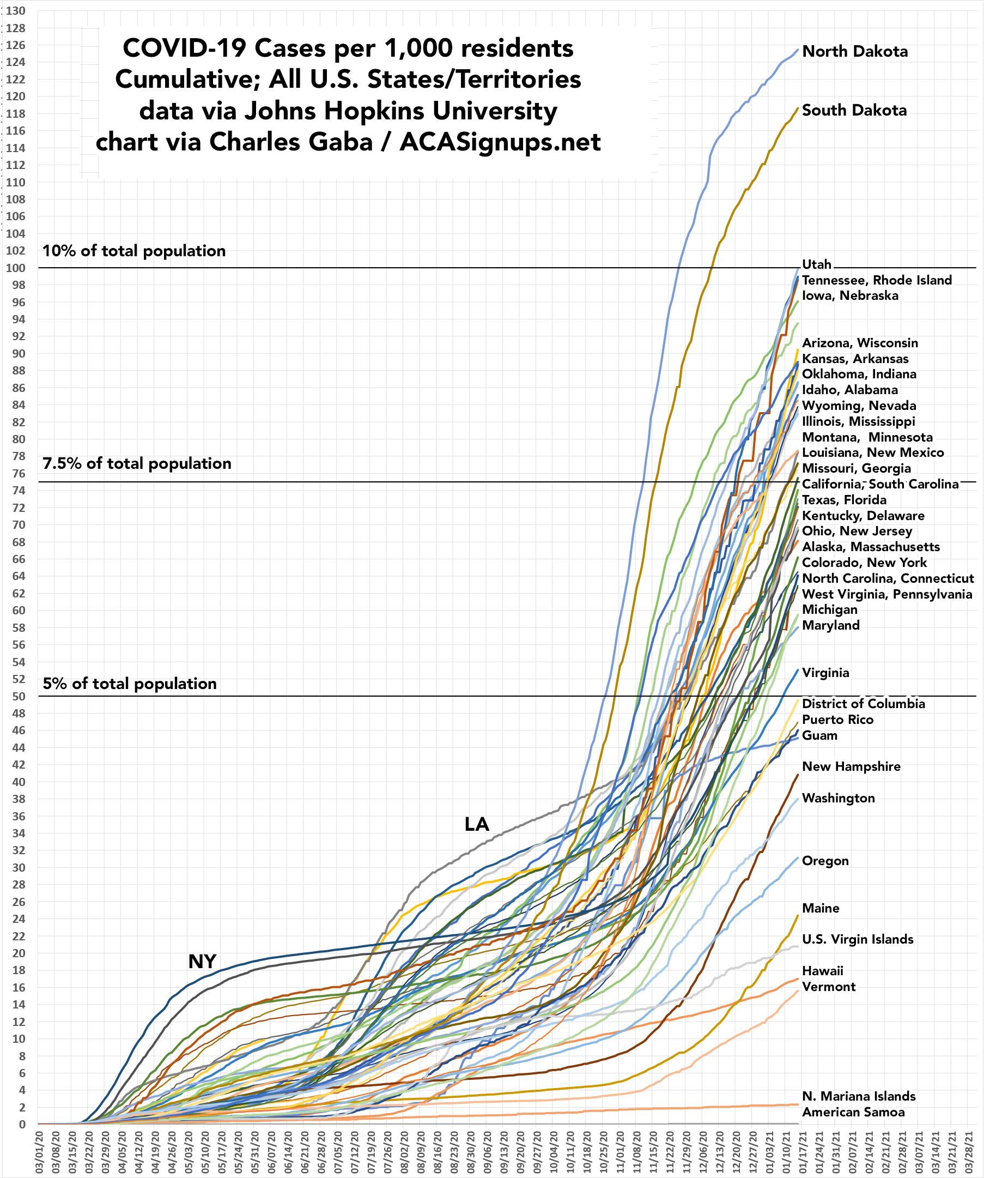I've done my best to label every state/territory, which obviously isn't easy to do for most of them given how tangled it gets in the middle. For cases per capita, the most obvious point is that New York and New Jersey, which towered over every other state last spring, are now utterly dwarfed by North & South Dakota, although things are getting pretty horrible everywhere now.