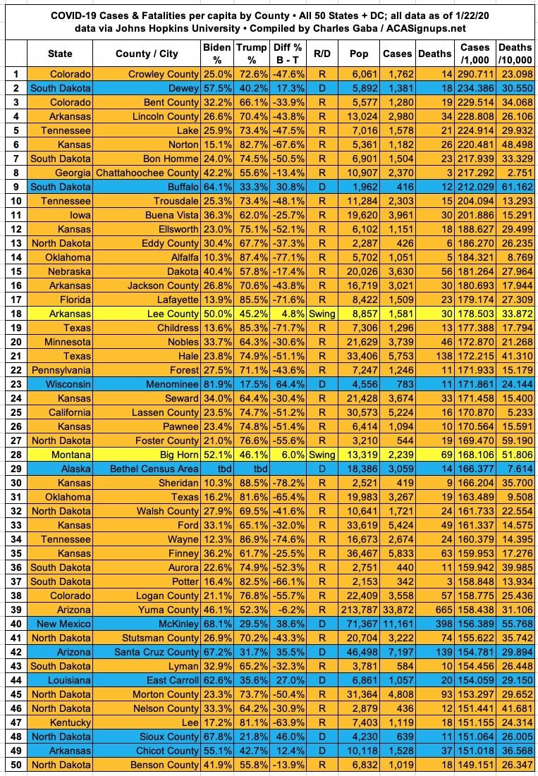 Here's the top 100 counties ranked by per capita COVID-19 fatalities as of Friday, January 22nd, 2021 (click image for high-res version):